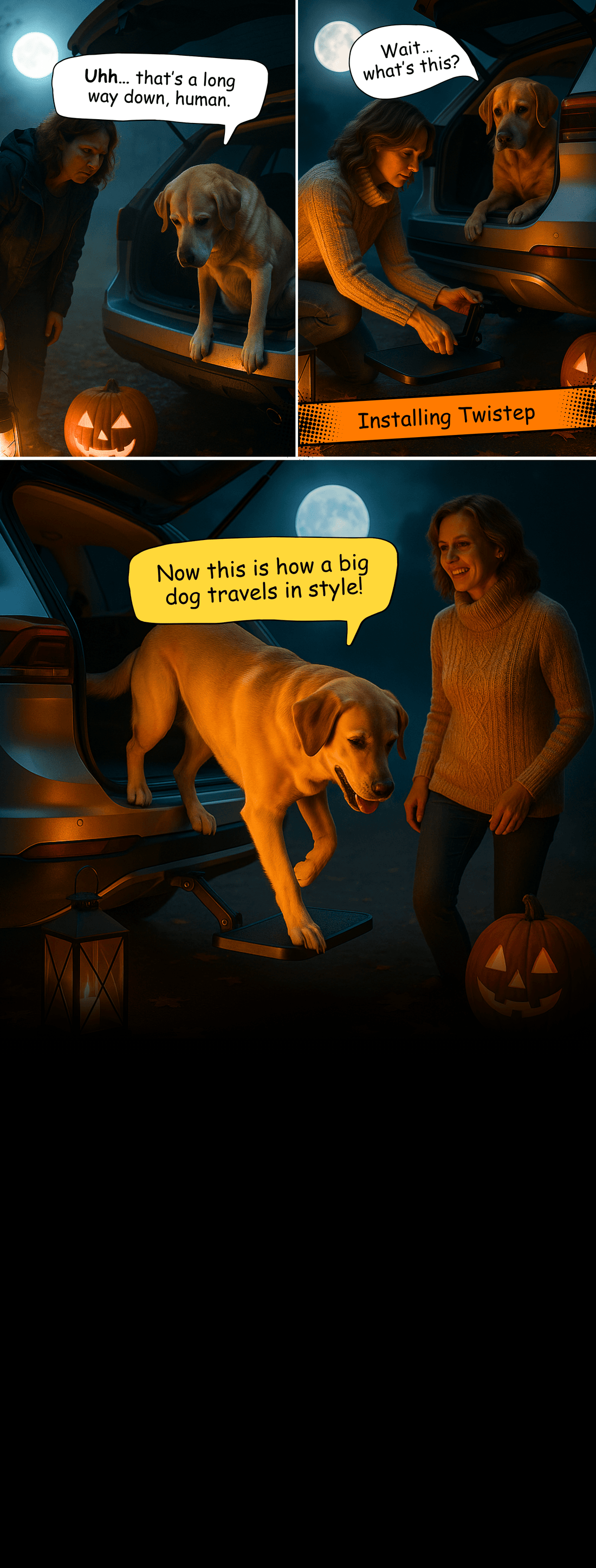 Really pleased with this product. We drive an FJ Crusier and have three Leonbergers (largest is 145lb). In the past we've tried dog ramps -which sort of worked, but were slow to use and cumbersome. This Twistep is great, you just pull the handle up nudge the step and round it swings. Super easy! It'd be nice if they put a reflective strip on the edge-left out its a bit of a bump hazard.For me the only drawback was I also used the hitch for my bike rack. After months of swapping between them I finally modified a hitch splitter to allow both bike rack and Twistep to be mounted simultaneously-it works great! (If only Heininger would offer modified hitch splitters as an accessory).