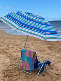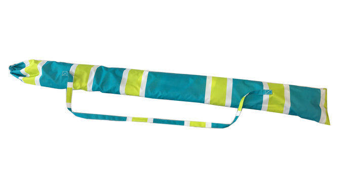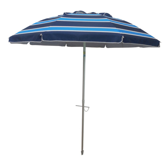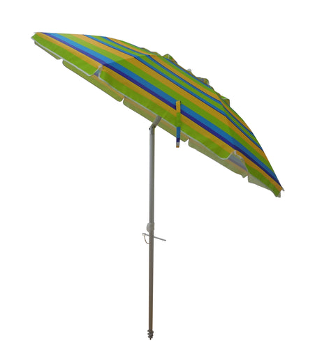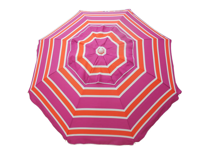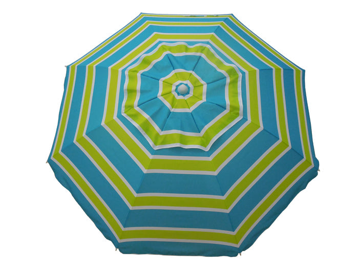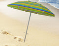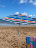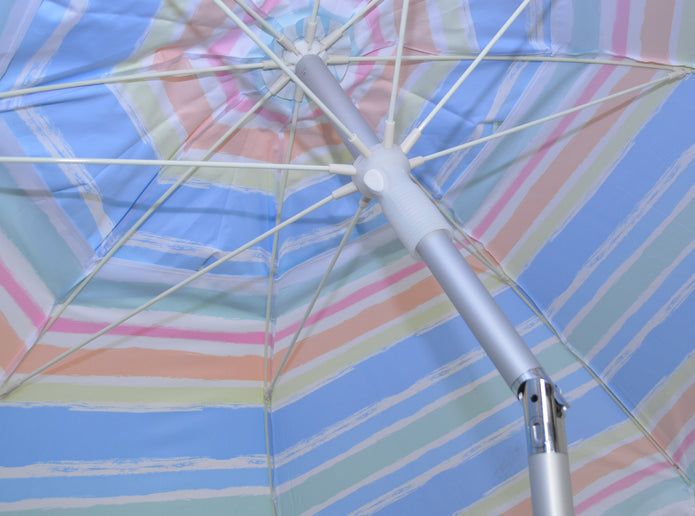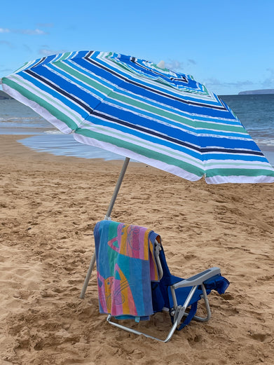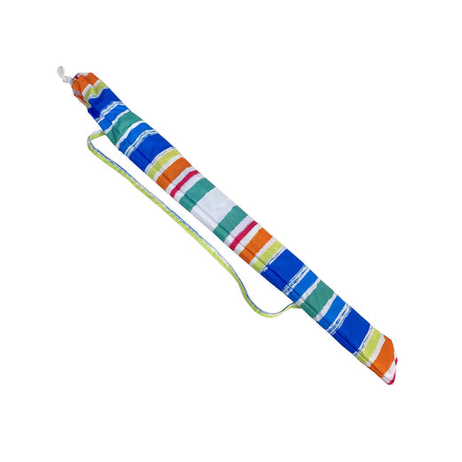 Head to the beach with this 7' Beach Umbrella! With a fun and colorful stripe pattern this umbrella instantly makes any outdoor activity feel like a party, with its fun and colorful stripe design. Also works great next to the pool- just stick the pole in the grass! The 7 foot diameter umbrella will keep you and your friends or family shaded from the suns harmful UV rays as well as any uncooperative weather.