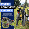 200 lb Total Capacity: Transporting your bikes has never been easier, with a total weight capacity of 200 pounds. Each bike can carry up to 100 pounds, thanks to our universal tire holders and wheel straps compatible with e-bikes, mountain bikes, and road bikes featuring up to 5” fat tires.