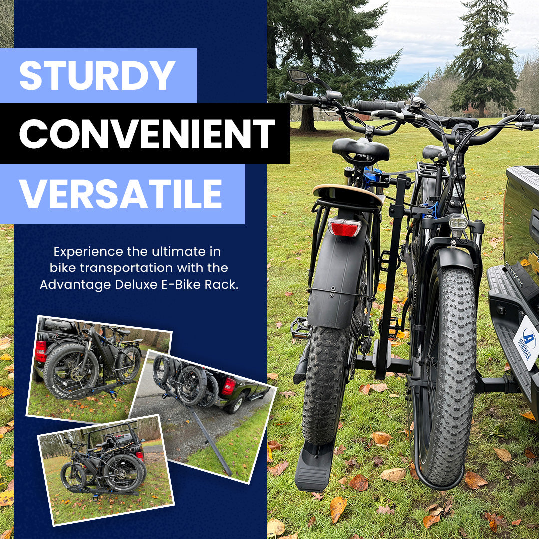 Experience the ultimate in bike transportation with the Advantage Deluxe E-Bike Rack. Engineered for safety, convenience, and versatility, this hitch-mounted platform-style rack ensures your bikes stay secure on and off-road. With a total weight capacity of 200 pounds and compatibility with various bike types, including e-bikes and mountain bikes with up to 5” fat tires, this rack offers unparalleled flexibility. Its user-friendly design features a convenient handle for easy lifting and foldable storage when not in use. Plus, with a sturdy 2-inch hitch receiver and simple adaptation to different bike lengths, installation and stability are a breeze. Say goodbye to wobbly, unreliable bike racks – the Advantage Deluxe E-Bike Rack is your go-to solution for hassle-free bike transportation wherever your adventures take you.