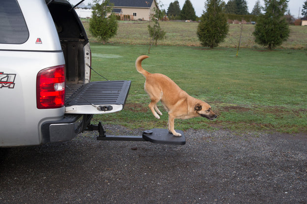 TWISTEP is an instant, multi-use step that helps your dog get in and out of your Pickup Truck easily. It attaches to the hitch receiver of your vehicle and stores under the bumper when not in use. TWISTEP provides your pet with lower-impact, lower-stress access into and out of a vehicle. Repeated jumping into and out of a vehicle can aggravate or even cause serious conditions like arthritis, leg injuries, back sprains and other spinal damage. And lifting a large dog into a vehicle isn't easy! TWISTEP can help dogs of all ages get into a vehicle. Young dogs can avoid unnecessary stress on growing hips and elbows. Active dogs can appreciate a step up at the end of a long day of hiking, hunting and other outdoor activities. And TWISTEP can help older dogs, who may suffer from arthritis and who can no longer enter a vehicle on their own. TWISTEP easily swivels out from under the vehicle in a few seconds just when you need it. And it tucks out of the way under the bumper when you don't. TWISTEP fits trucks with a 2" receiver hitch.